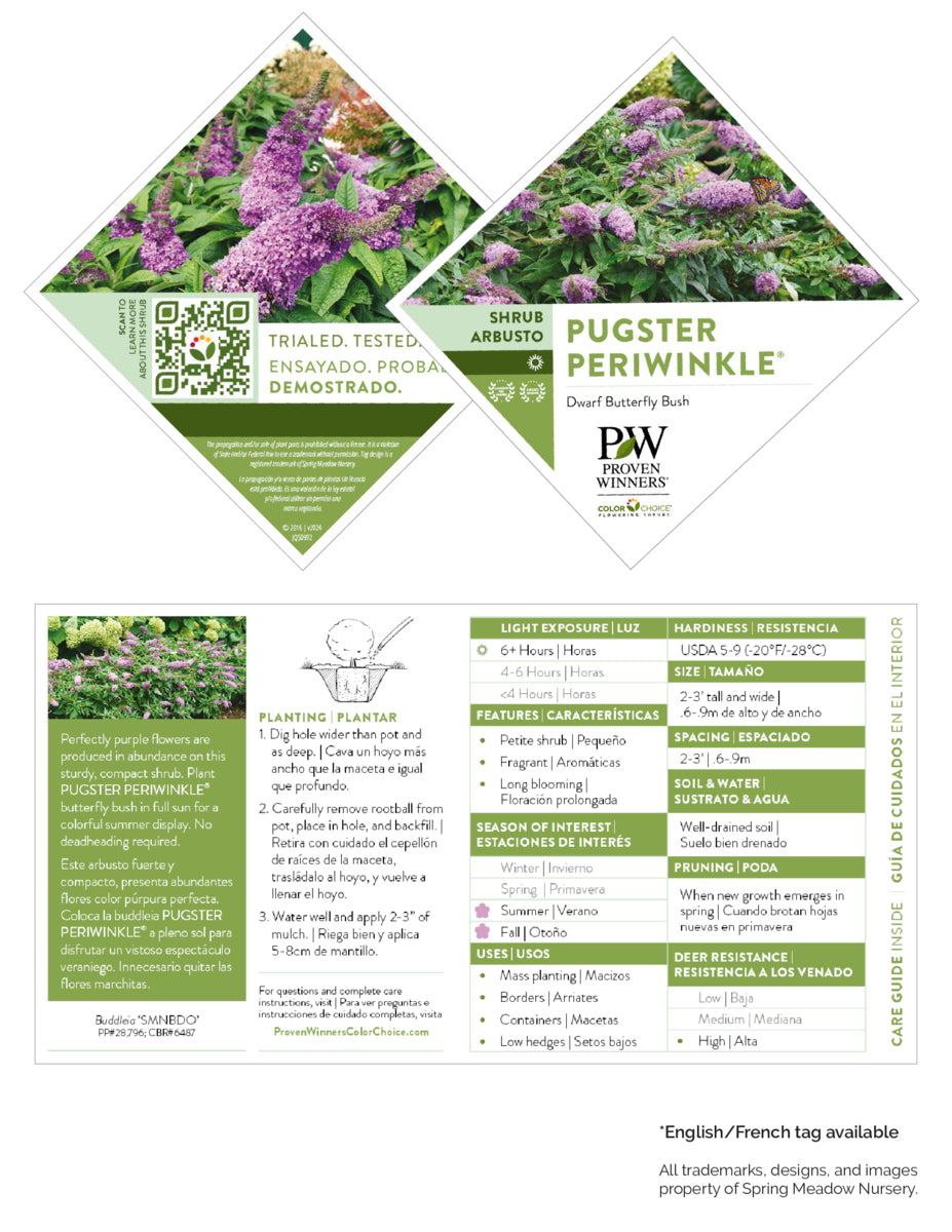 Perfectly purple flowers are produced in abundance on this sturdy, compact shrub. Plant Pugster Periwinkle® butterfly bush in full sun for a colorful summer display. No deadheading required.
