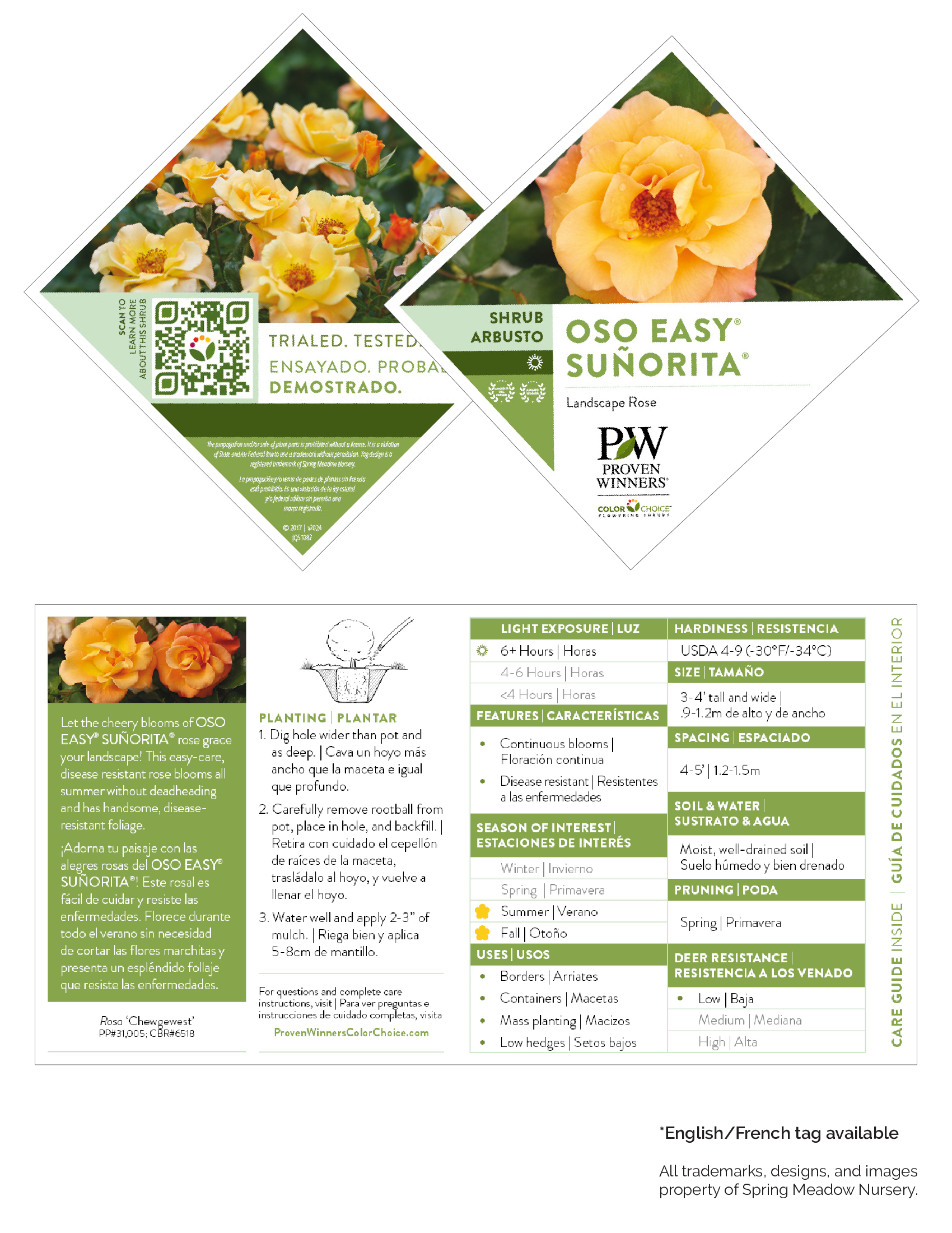 Let the cheery blooms of Suñorita® rose grace your landscape! This easy-care, disease resistant rose blooms all summer without deadheading and has handsome, disease-resistant foliage.