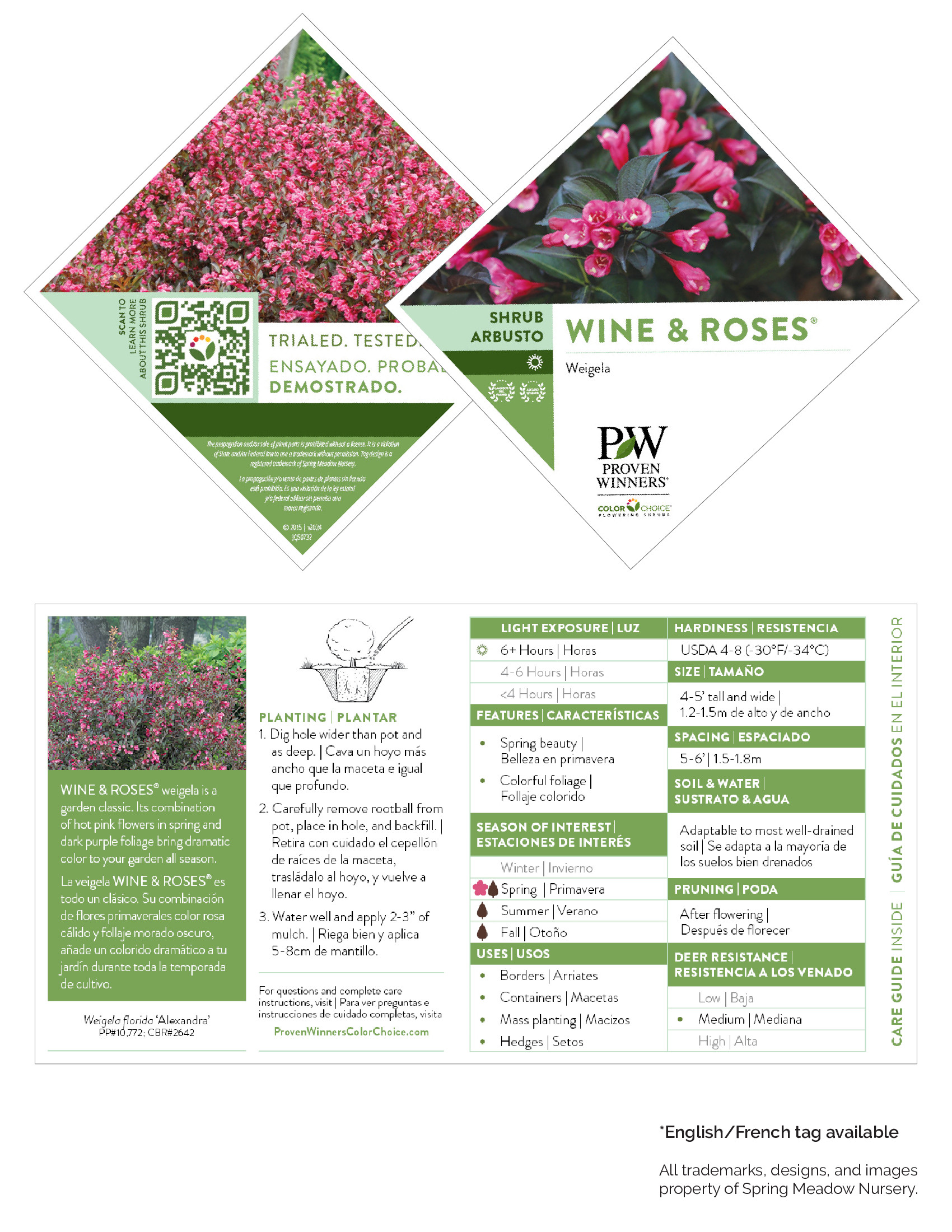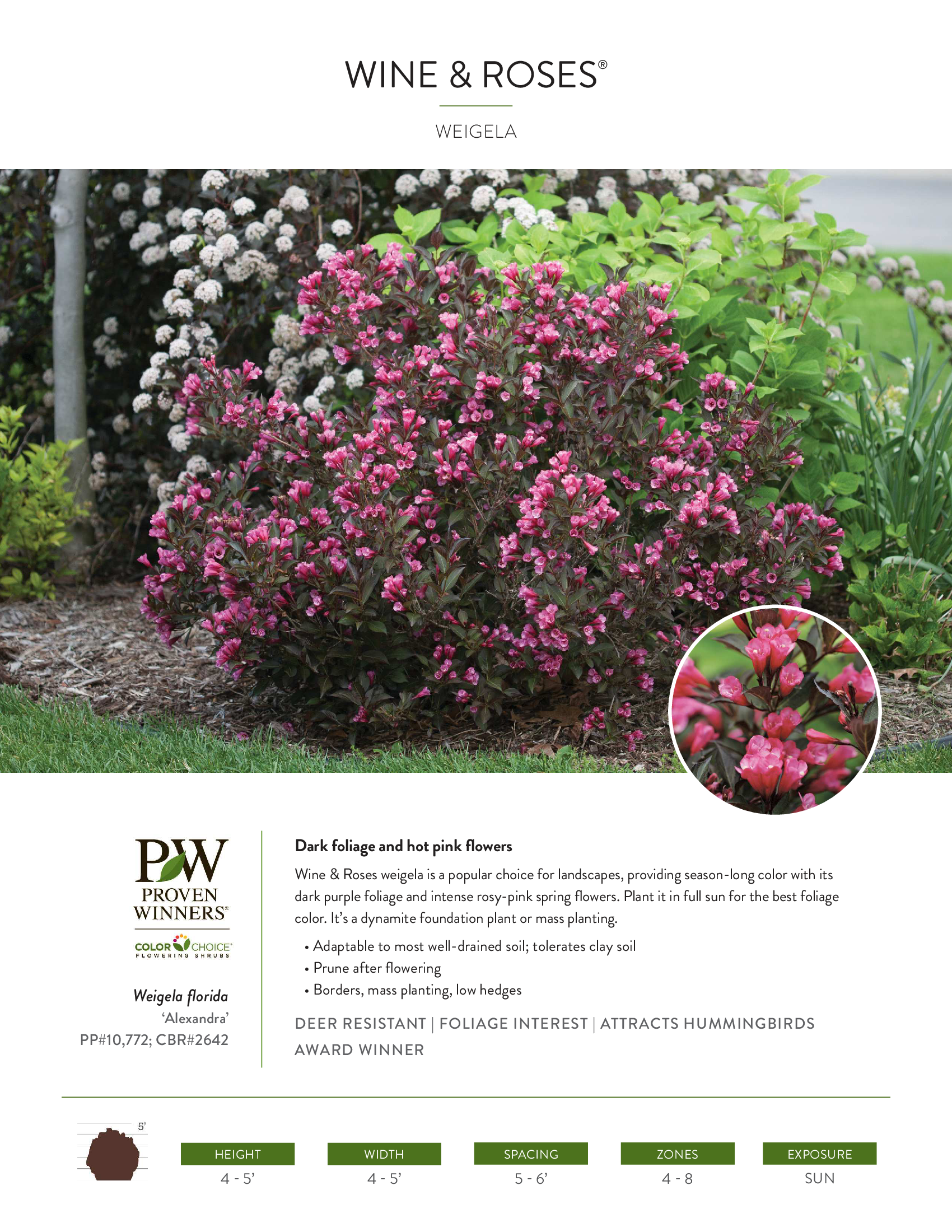 Wine & Roses® weigela is a garden classic. Its combination of hot pink flowers in spring and dark purple foliage bring dramatic color to your garden all season.